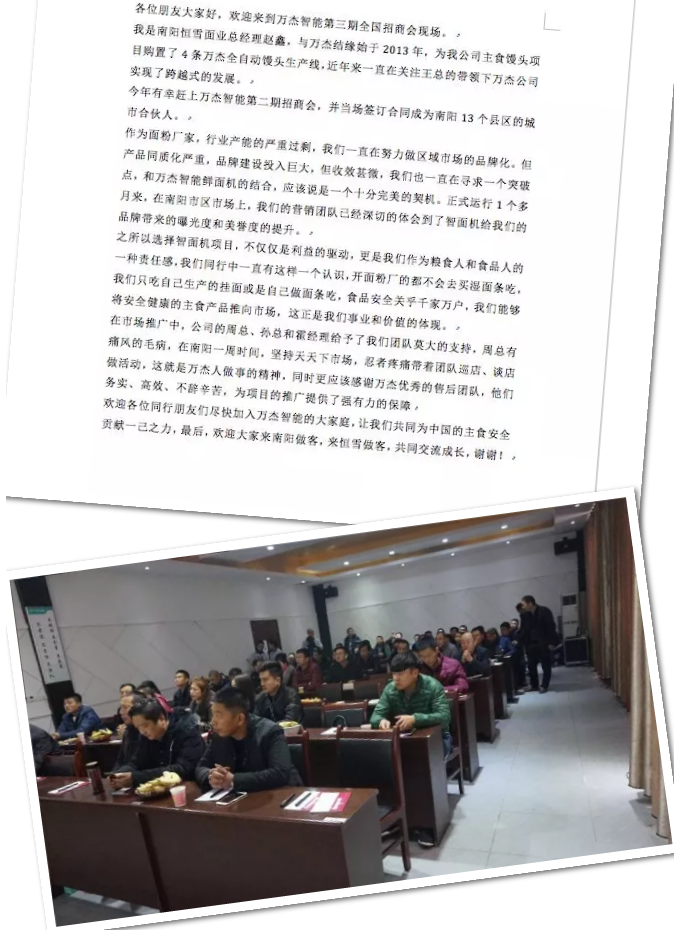 | 2017年12月29日,萬杰智能鮮面機第三期全國招商會和中型生產(chǎn)線新品發(fā)布會同時在萬杰智能總部召開。在新的一年即將到來之際,眾多經(jīng)銷商和糧油界的朋友們寄托新的希望,齊聚萬杰展望未來,共謀未來發(fā)展新商機。 為了讓嘉賓們能夠更加深入的了解萬杰智能,主辦方特地安排嘉賓在招商會當天上午參觀萬杰智能工廠,從生產(chǎn)制造中心、研發(fā)中心、產(chǎn)品展示廳到遠程控制中心,使嘉賓們充分了解萬杰智能的研發(fā)能力和制造實力,深切感受到萬杰智能20年的積累。 經(jīng)過午餐和簡單的茶歇,嘉賓們齊聚萬杰招商會現(xiàn)場,萬杰智能第三期全國招商大會正式開始。會上,首先由北京先行曾鵬飛為意向合伙人做萬杰智能鮮面機的項目介紹;然后由萬杰智能科技股份有限公司王曉杰董事長做“傳統(tǒng)還在,未來已來”主題報告;最后由來自南陽和新鄉(xiāng)的城市合伙人為意向合伙人分享市場心得和運營經(jīng)驗,涵蓋了從終端洽談、現(xiàn)場陳列、消費者溝通等眾多細節(jié),內(nèi)容豐富全面,引來現(xiàn)場不少嘉賓的共鳴。 由于萬杰智能鮮面機擁有出色的產(chǎn)品力和科學(xué)的商業(yè)模式,現(xiàn)場不少嘉賓都對萬杰智能鮮面機項目產(chǎn)生了濃厚的興趣。目前,萬杰智能的相關(guān)工作人員正在和有合作意向的嘉賓就合作細節(jié),進行深度的商談接洽。 本次招商會的順利召開,為中國的傳統(tǒng)制造行業(yè)注入了一股新的活力。未來,萬杰智能將繼續(xù)堅持科技智能創(chuàng)新,為中國的老百姓創(chuàng)造更多更好的智能主食機械,為中國億萬家庭的主食安全保駕護航。 招商會花絮 |